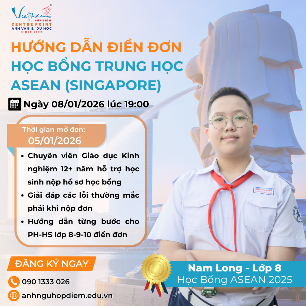 08/01/2026 Online Seminar: Hợp Điểm hướng dẫn điền đơn Học bổng Trung học ASEAN 2026 (Singapore)