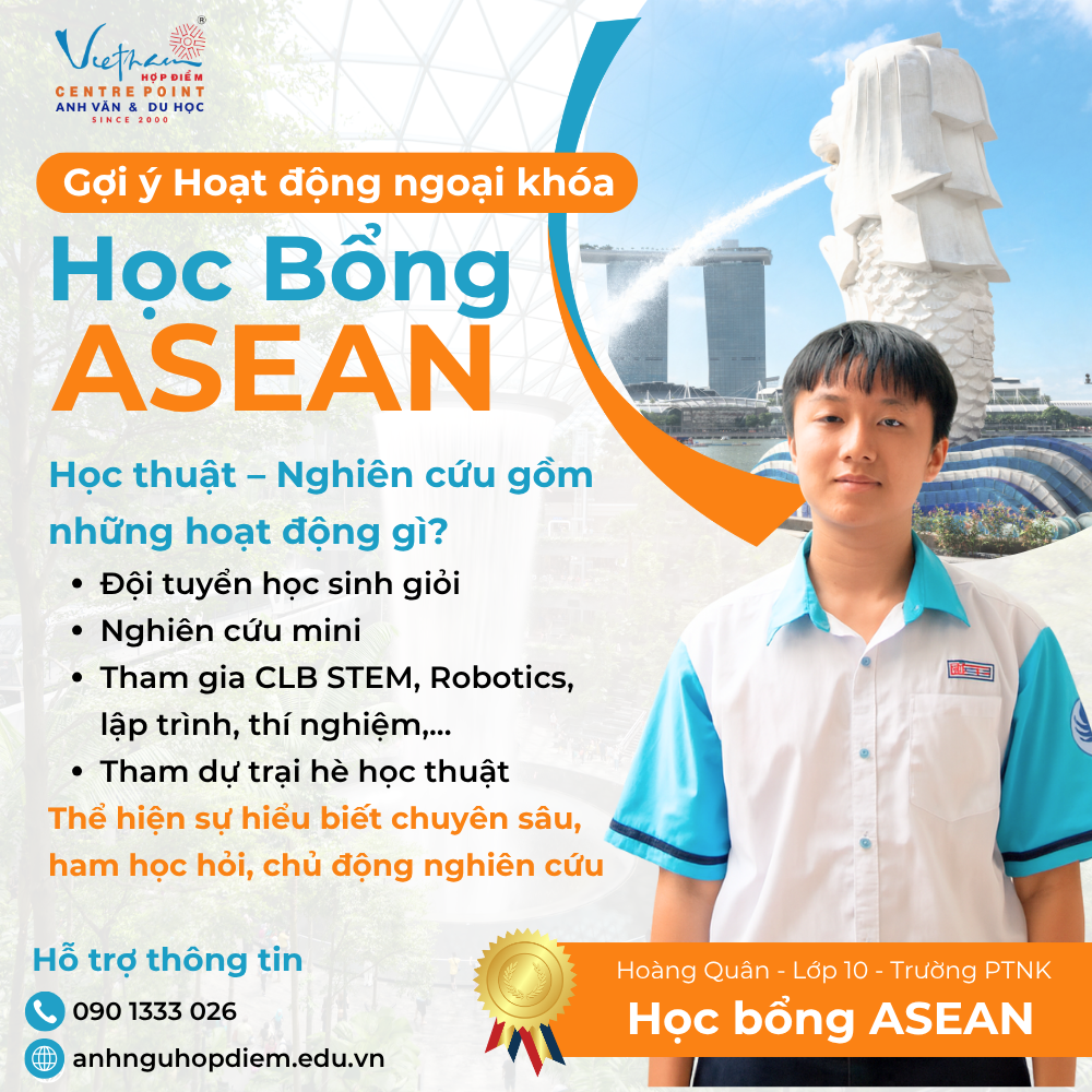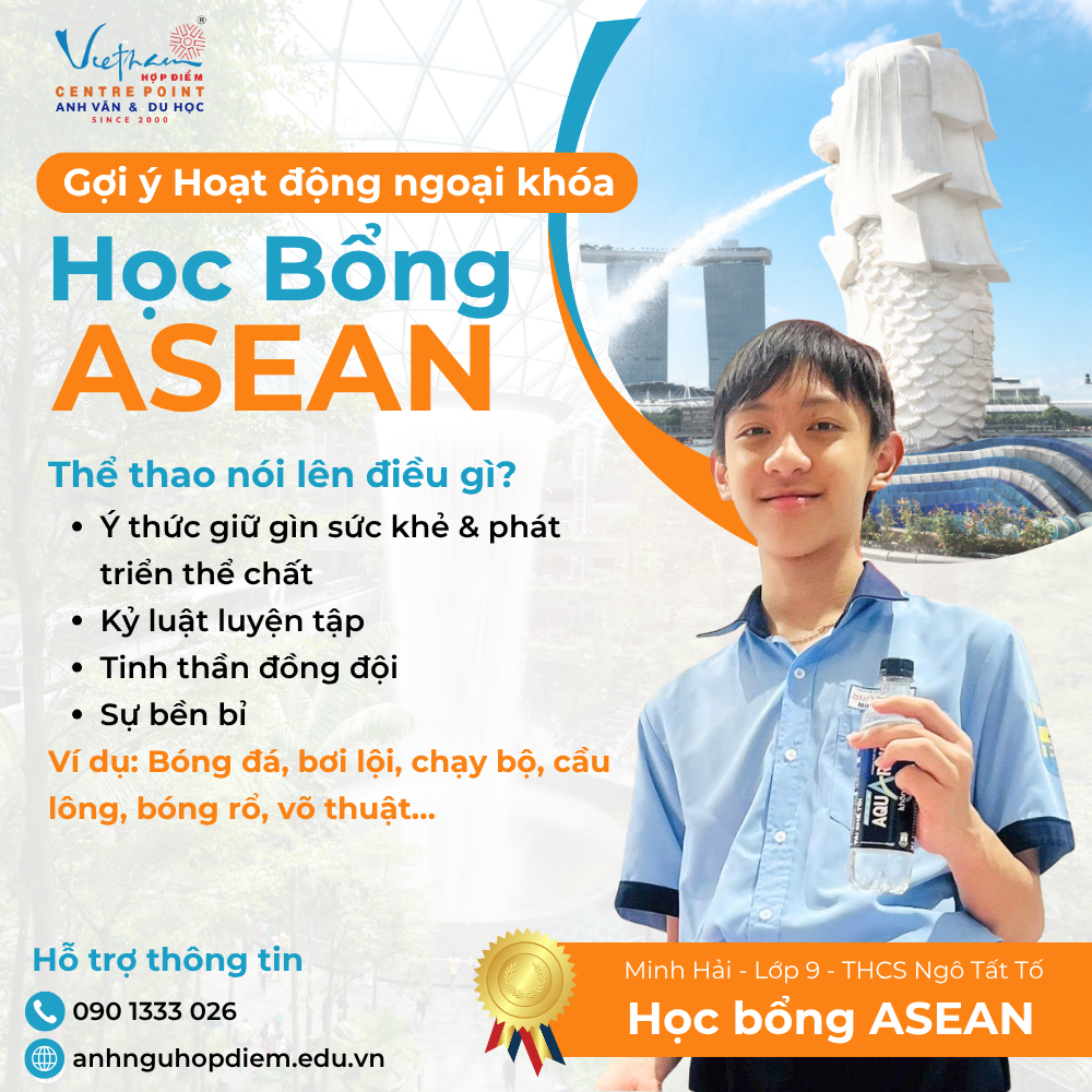 Học bổng ASEAN – Trung học Singapore luôn được xem là một trong những chương trình học bổng danh giá nhất dành cho học sinh Việt Nam lớp 8 – 9 – 10. Không chỉ yêu cầu học lực tốt và khả năng tiếng Anh ổn định, hoạt động ngoại khóa chính là yếu tố quan trọng giúp bạn thể hiện một hồ sơ toàn diện, năng động và phù hợp với triết lý giáo dục Singapore.