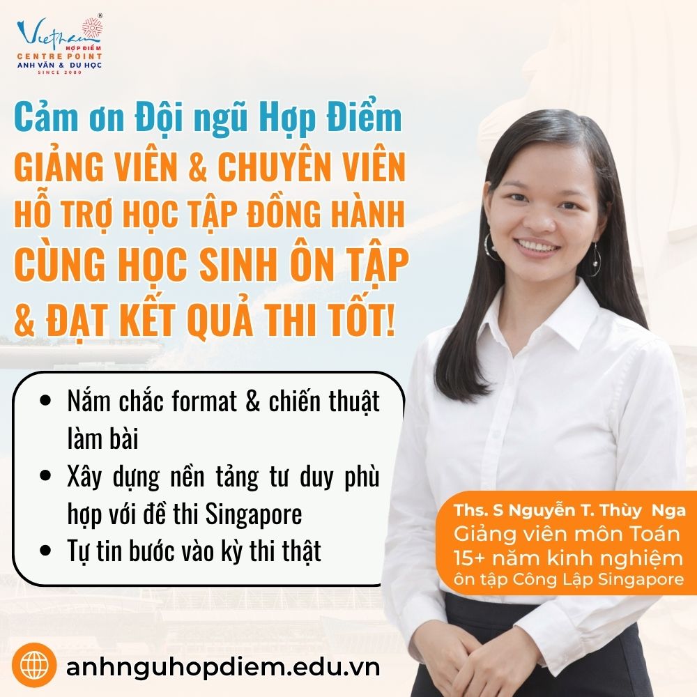 Với hơn 20 năm kinh nghiệm trong chương trình ôn tập & học bổng công lập Singapore, Hợp Điểm đã đồng hành cùng hàng trăm học sinh Việt Nam. Chinh phục thành công các kỳ thi tuyển sinh quốc tế.