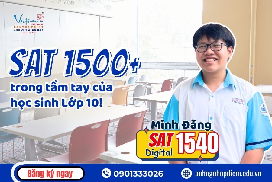 SAT 1500+ không chỉ là điểm số – đó là tấm vé vàng giúp học sinh vươn ra thế giới. Với sự đồng hành của Hợp Điểm, ngay cả học sinh lớp 10 cũng có thể đạt thành tích xuất sắc này.