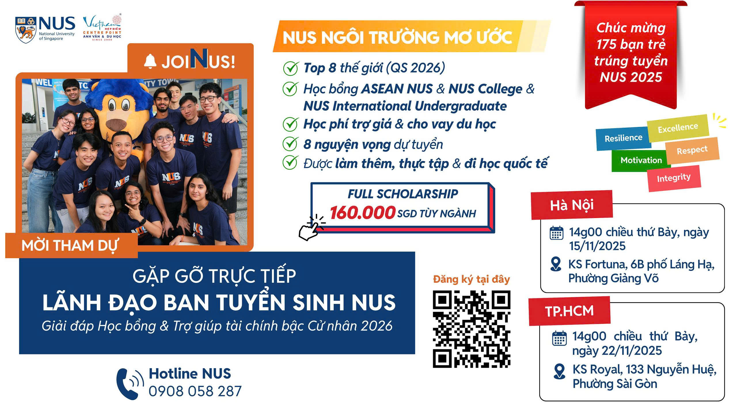 Đây là dịp hiếm hoi trong năm để phụ huynh và học sinh Việt Nam trực tiếp gặp đại diện NUS, đặt câu hỏi, được giải đáp thắc mắc cụ thể về hồ sơ học bổng, quy trình xét tuyển, và chiến lược học tập hiệu quả để chinh phục học bổng toàn phần.