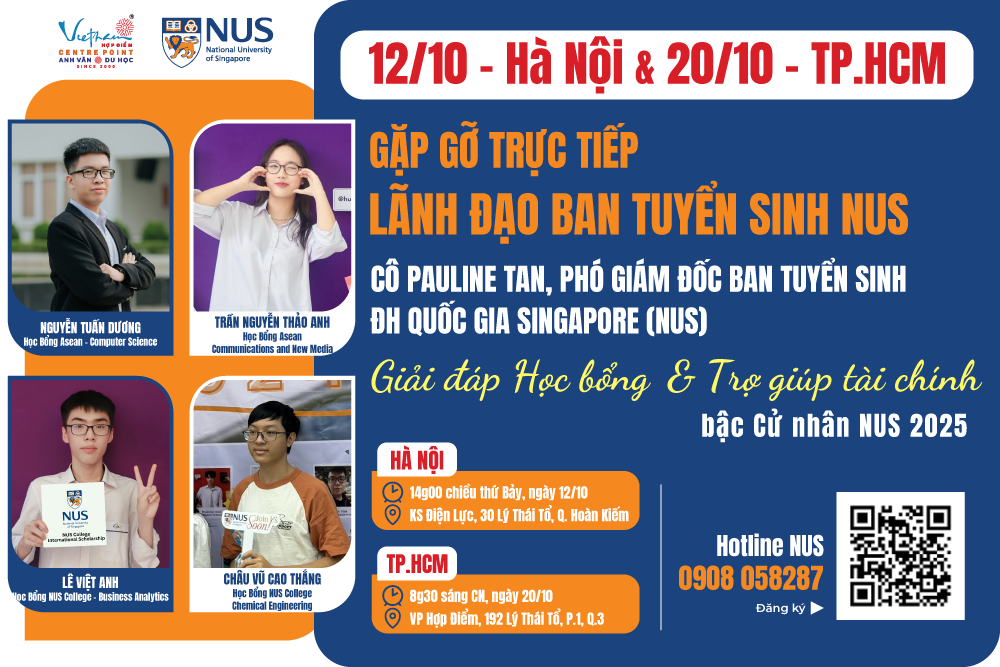 Cô Pauline Tan – Phó Giám đốc Ban tuyển sinh ĐH Quốc gia Singapore (NUS) và ông Trần Hữu Phúc Tiến – Trưởng đại diện tuyển sinh NUS sẽ trực tiếp thông tin học bổng & trợ giúp tài chính bậc cử nhân NUS 2025.