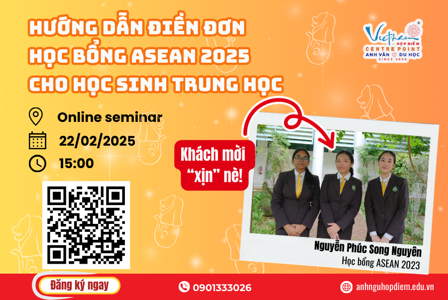 Bạn là học sinh trung học lớp 8-9-10, đang ấp ủ ước mơ nhận học bổng ASEAN danh giá? Đừng bỏ lỡ buổi hướng dẫn trực tuyến miễn phí do Hợp Điểm tổ chức – nơi cung cấp những thông tin và kinh nghiệm thực tế giúp bạn tự tin chinh phục học bổng! 💡 Khi tham gia cùng chúng mình, bạn sẽ: 🏅Bạn Nguyễn Phúc Song Nguyên – Học viên xuất sắc của Hợp Điểm đã trúng truyển Học Bổng Trung Học ASEAN 2023 sẽ đồng hành, giải đáp các thắc mắc về cách điền đơn và chia sẻ kinh nghiệm của bản thân trong buổi giao lưu này. Ngoài Học bổng ASEAN, Song Nguyên còn “bỏ túi” cùng với bộ thành tích “khủng” nhận được lời mời 6 xuất học bổng từ 6 trường trung học quốc tế khi chỉ mới 14 tuổi nữa! Tìm hiểu thêm về hành trình chinh phục các học bổng “xịn” của Song Nguyên tại đây! 📅 Hình thức: Online seminar 🌟Học bổng ASEAN không chỉ mang lại cơ hội học tập tại Singapore – môi trường học tập hàng “top” thế giới, mà còn là nơi giúp bạn phát triển toàn diện cả về kỹ năng lẫn tư duy. Đây là bệ phóng tuyệt vời để bạn mở ra tương lai tươi sáng hơn, giúp bạn ra khơi chinh phục thế giới. Hãy cùng Hợp Điểm khởi động năm 2025 bằng hành trình chinh phục học bổng đầy ý nghĩa này.