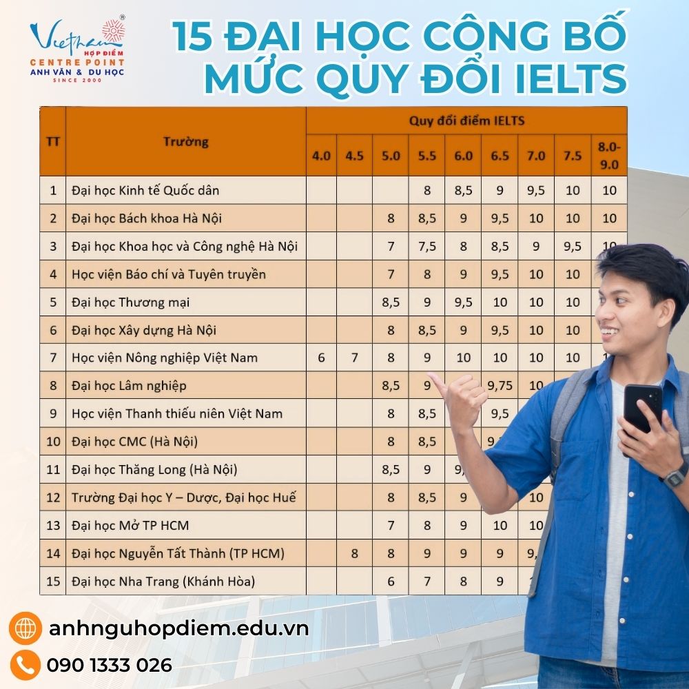 Đặc biệt, đã có 15 trường đại học công bố bảng quy đổi IELTS chi tiết, mở ra cơ hội rõ ràng cho thí sinh sở hữu chứng chỉ ngoại ngữ quốc tế này.