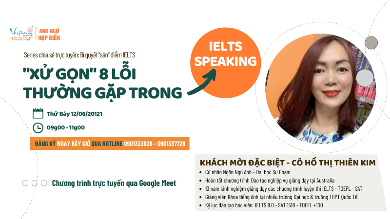 Series chia sẻ trực tuyến “Bí quyết săn điểm IELTS” là chương trình do Anh Ngữ Hợp Điểm tổ chức định kỳ vào 09g00 sáng thứ Bảy hằng tuần. Chương trình với sự góp mặt của các khách mời đặc biệt là những Giảng viên kỳ cựu với bề dày kinh nghiệm giảng dạy nhiều năm các chương trình học thuật như IELTS, TOEFL, SAT, …Ngoài ra còn có sự chia sẻ thực tế “người thật việc thật” từ những bạn học viên đã “chinh chiến” các kỳ thi. Số đầu tiên ra mắt lúc 09g00 sáng thứ Bảy 12/06 với chủ đề “Xử gọn 8 lỗi thường gặp trong IELTS Speaking” cùng sự tham gia của khách mời đặc biệt: cô Hồ Thị Thiên Kim và hai bạn học viên đến từ trường THPT Nguyễn Thương Hiền.