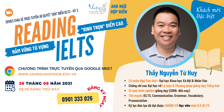 Số thứ ba của Series chia sẻ trực tuyến “Bí quyết săn điểm IELTS” sẽ tiếp tục ra mắt lúc 09g00 sáng thứ Bảy 26/06 với chủ đề “Reading IELTS – Nắm vững từ vựng, rinh trọn điểm cao” cùng sự tham gia của khách mời đặc biệt: Thầy Nguyễn Từ Huy – Giáo viên với kỷ lục đào tạo KHÔNG CÓ học viên dưới 6.5 IELTS.