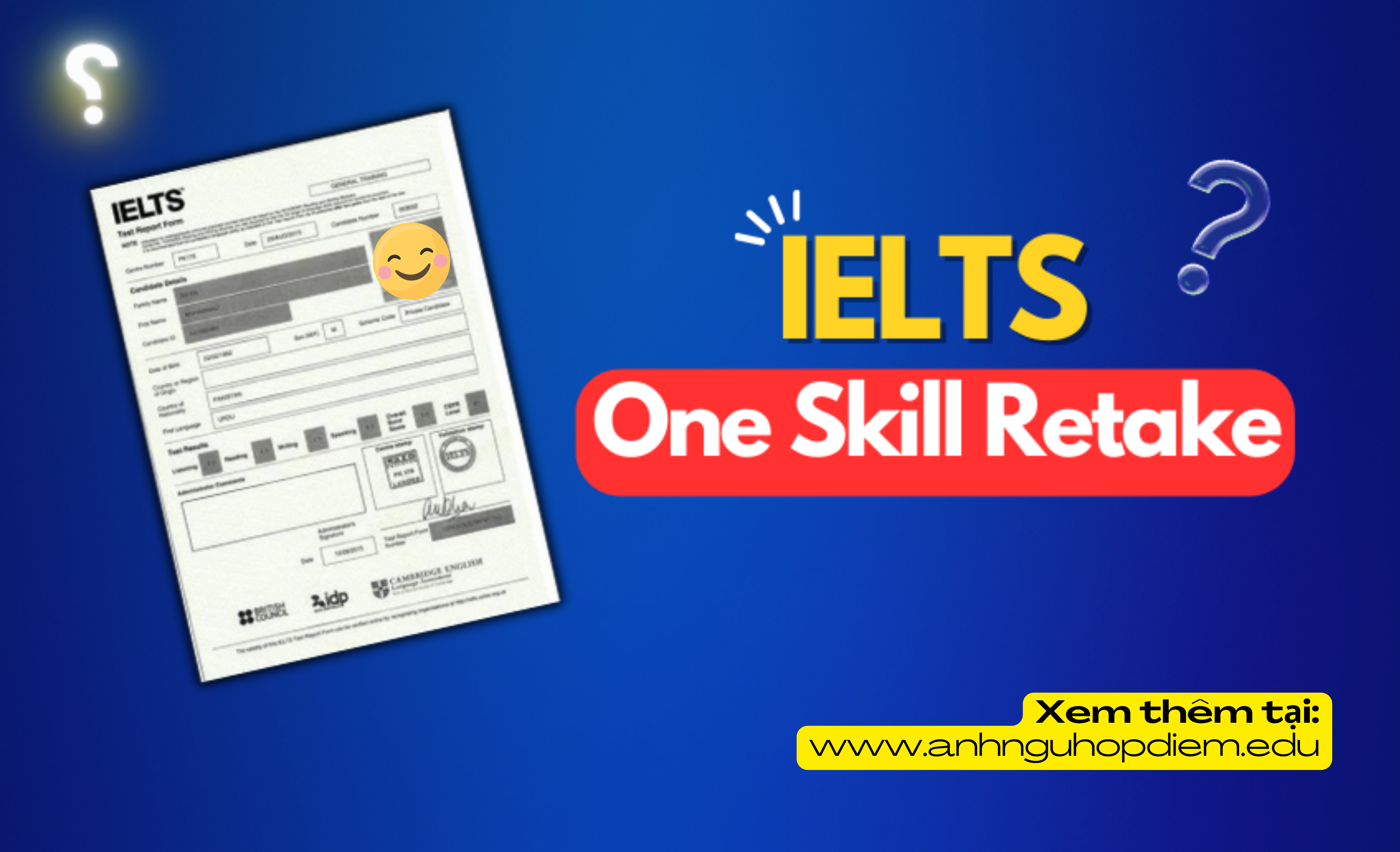 • Chỉ áp dụng cho thí sinh đã thi tại trung tâm có chức năng tổ chức IELTS One Skill Retake.